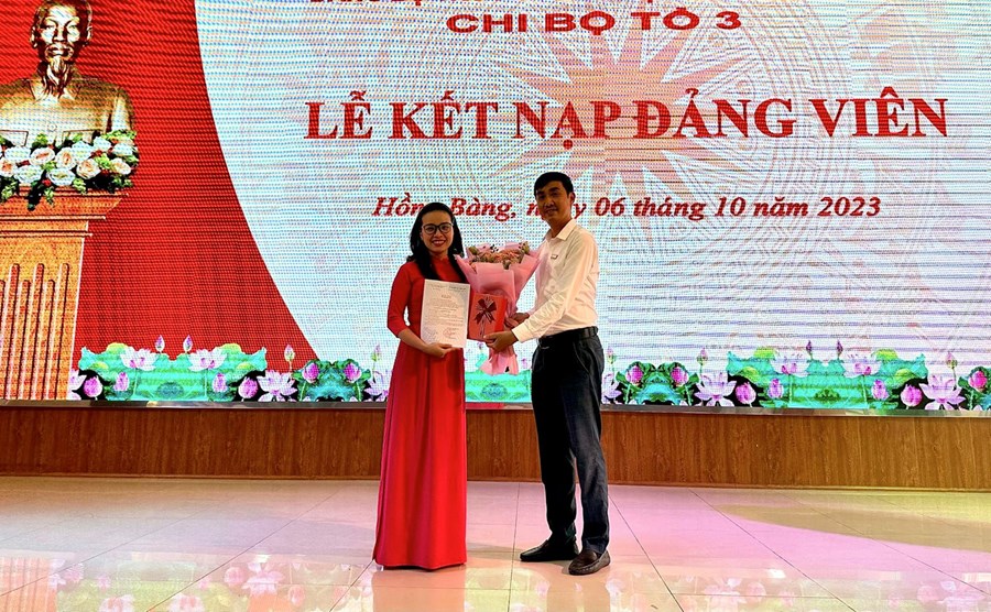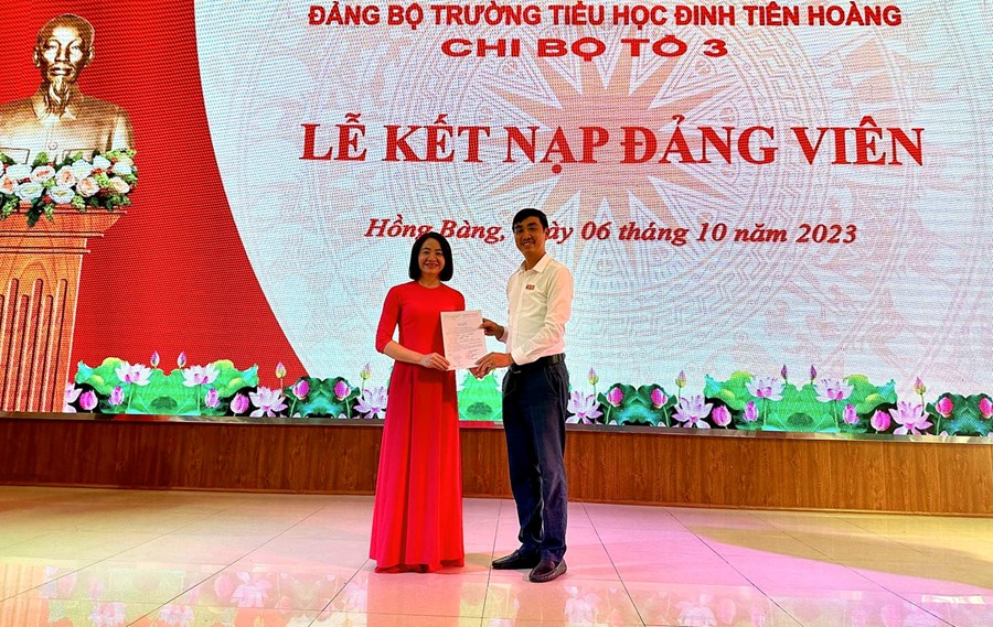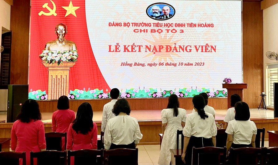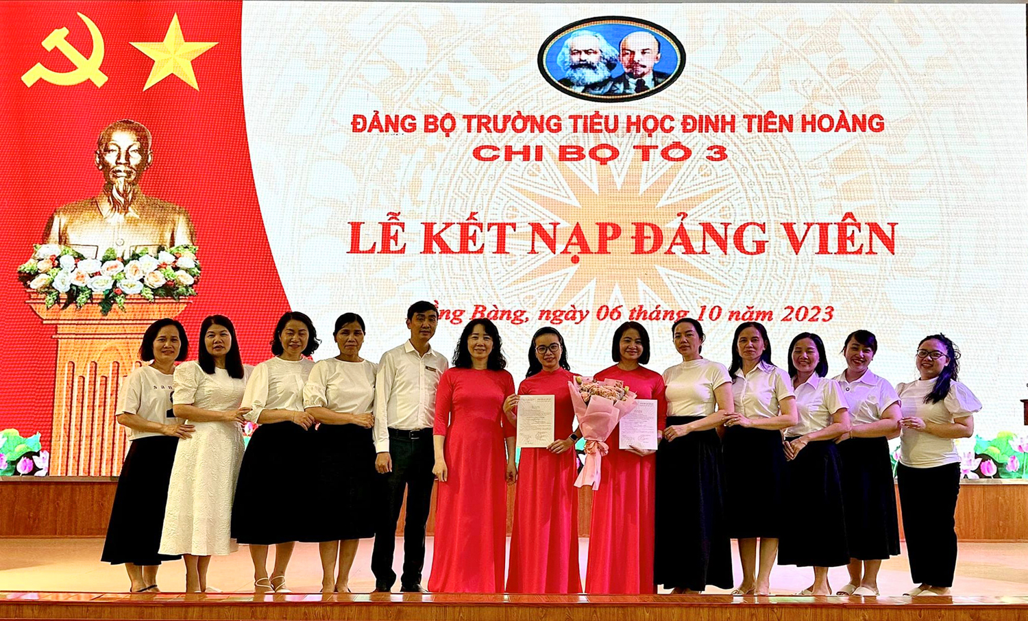 Thực hiện Quyết định của Ban Thường vụ Quận uỷ Hồng Bàng, chiều 06/10/2023, tại Trường TH Đinh Tiên Hoàng, Chi bộ Tổ 3 thuộc Đảng bộ Trường Tiểu học Đinh Tiên Hoàng trang trọng tổ chức Lễ kết nạp đảng cho 02 quần chúng Nguyễn Thị Bích Hải và Lê Thị Ngọc Tuyền.