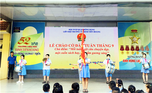 🌼💐 Thực hiện Chương trình công tác đội và phong trào thiếu nhi năm học 2022-2023. Sáng thứ 2 ngày 19 tháng 9 Liên đội trường TH Đinh Tiên Hoàng tổ chức Lễ chào cờ đầu tuần với chủ điểm “ Mỗi tuần một câu chuyện đẹp, một cuốn sách hay, một tấm gương sáng ”.