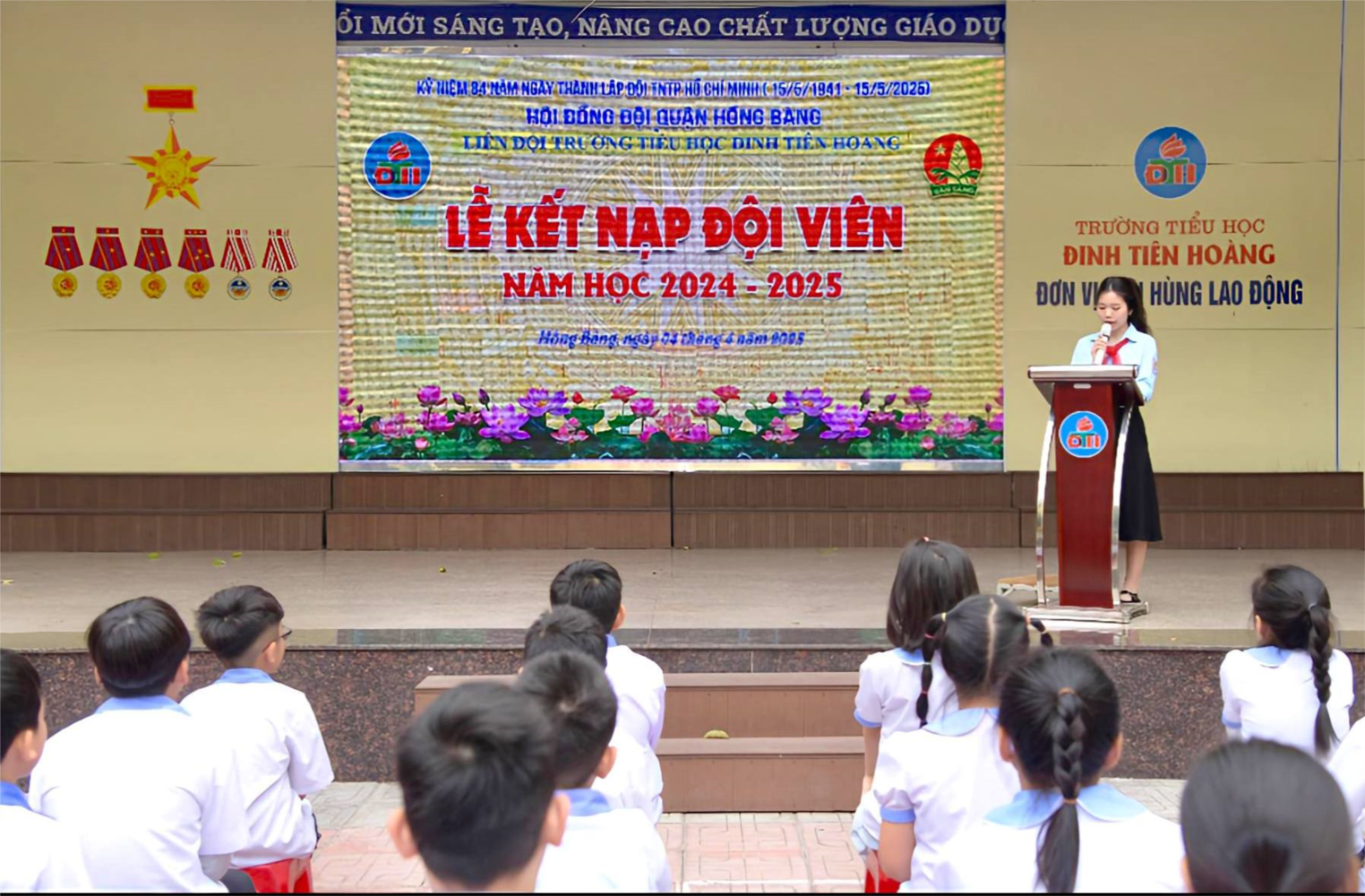 Giám hiệu nhà trường, sáng ngày 04/4/2025, Liên đội trường Tiểu học Đinh Tiên Hoàng long trọng tổ chức "Lễ kết nạp Đội viên" cho các em học sinh khối 3 có đủ điều kiện vào Đội.