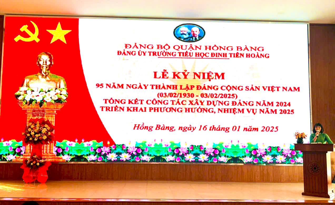 Thực hiện Kế hoạch của Quận uỷ Hồng Bàng; Căn cứ Chương trình công tác năm 2024 của Đảng uỷ nhà trường, hôm nay, ngày 16 tháng 01 năm 2025, Đảng uỷ Trường Tiểu học Đinh Tiên Hoàng long trọng tổ chức Lễ Kỷ niệm 95 năm Ngày Thành lập Đảng Cộng sản Việt Nam (03/02/1930 - 03/02/2025), tổng kết công tác xây dựng Đảng năm 2024 và triển khai phương hướng, nhiệm vụ năm 2025.
