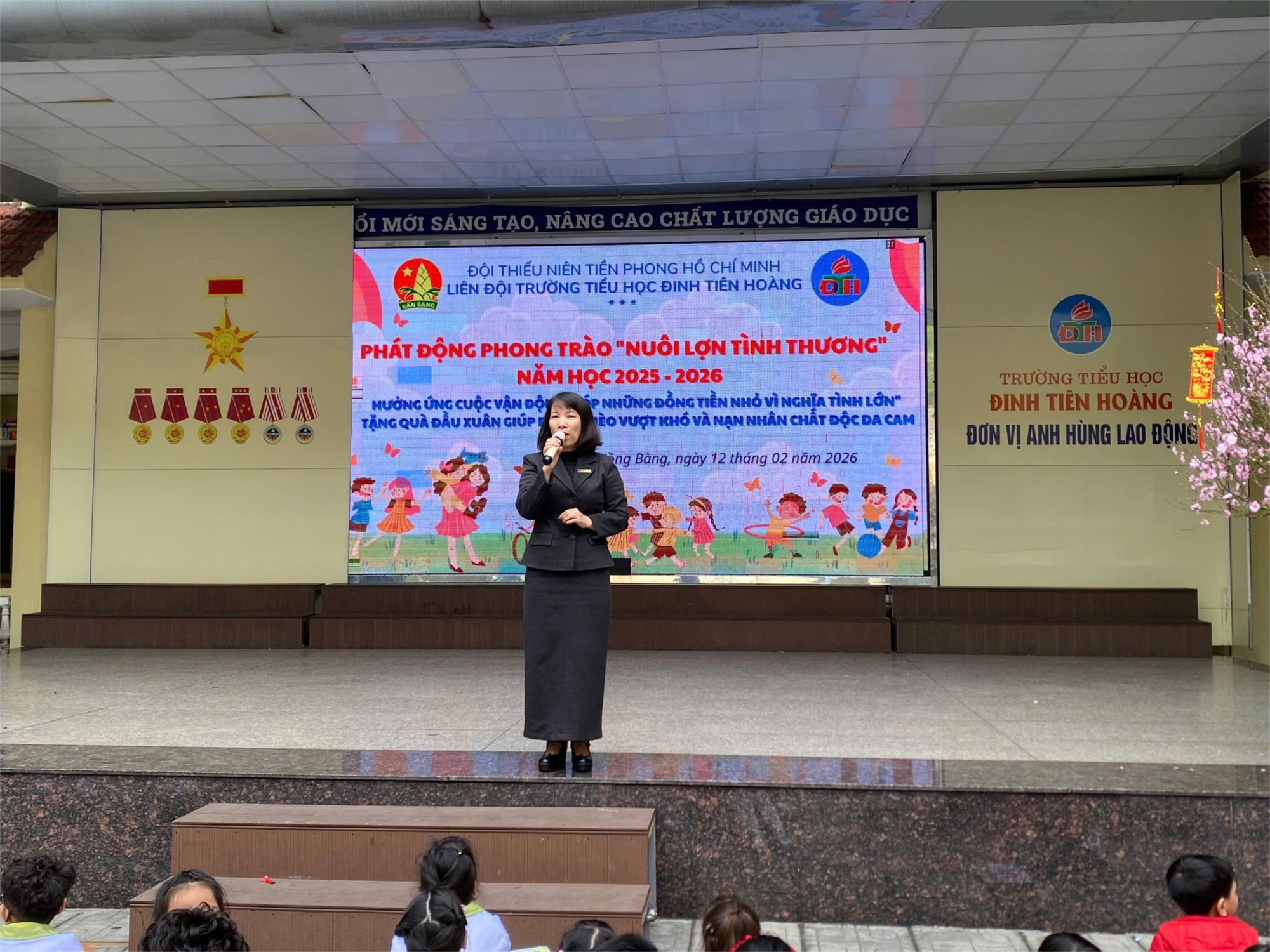 Sáng ngày 12/02/2026, Liên đội Trường Tiểu học Đinh Tiên Hoàng đã long trọng tổ chức Lễ phát động cuộc vận động **“Góp những đồng tiền nhỏ vì nghĩa tình lớn – Tặng quà đầu xuân giúp bạn khó khăn và nạn nhân chất độc da cam”** năm học 2025 - 2026.