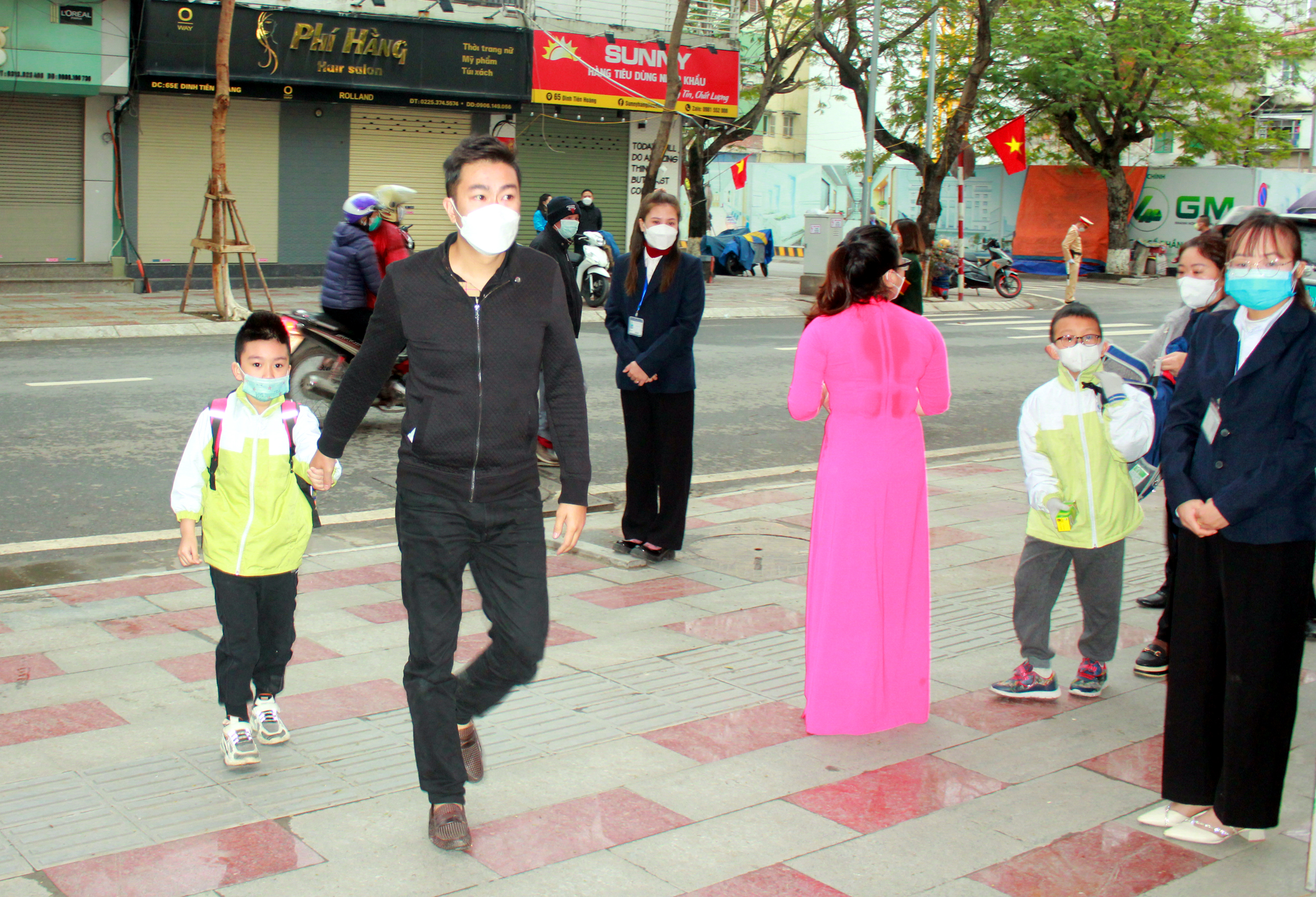 Đến trường, các em được cô giáo đón tại cổng trường, hướng dẫn đi theo làn để giữ khoảng cách với các bạn, rửa tay khử khuẩn và đo thân nhiệt. Và buổi chào cờ đầu tiên sau đợt nghỉ dịch cũng khác hơn trước. Thay vì tập trung học sinh ở sân trường, thì giáo viên chủ nhiệm cho học sinh chào cờ ngay trong lớp học và hướng dẫn nhanh cách rửa tay diệt khuẩn, các biện pháp phòng, chống dịch bệnh Covid-19.