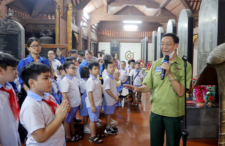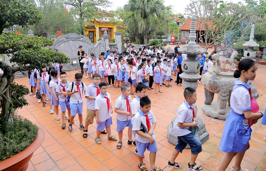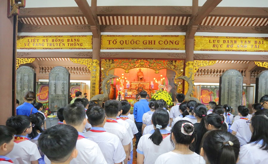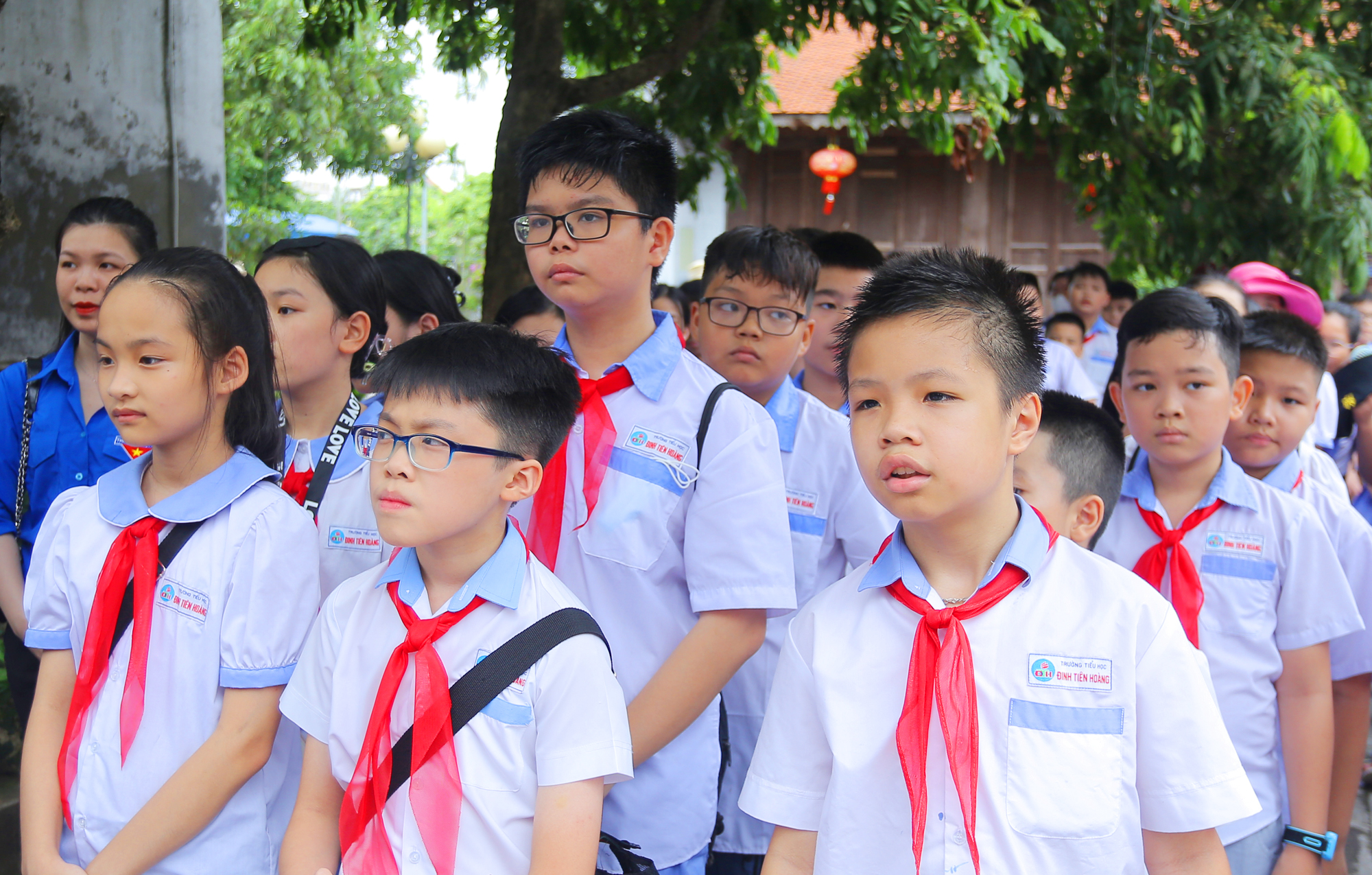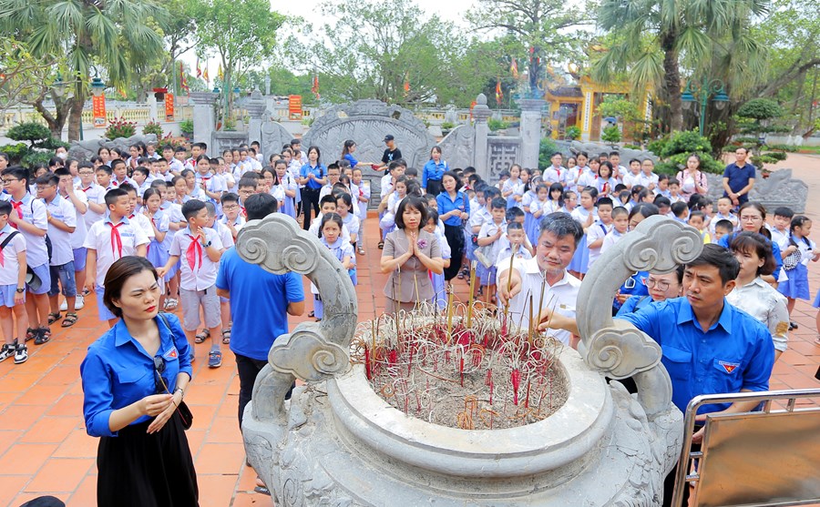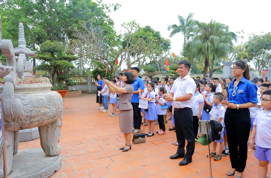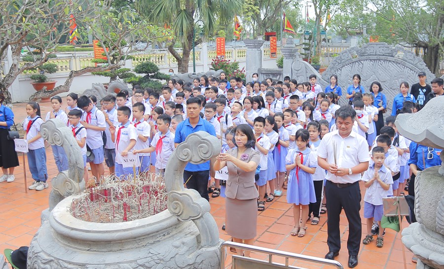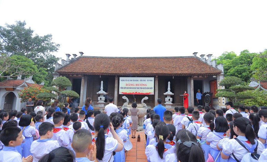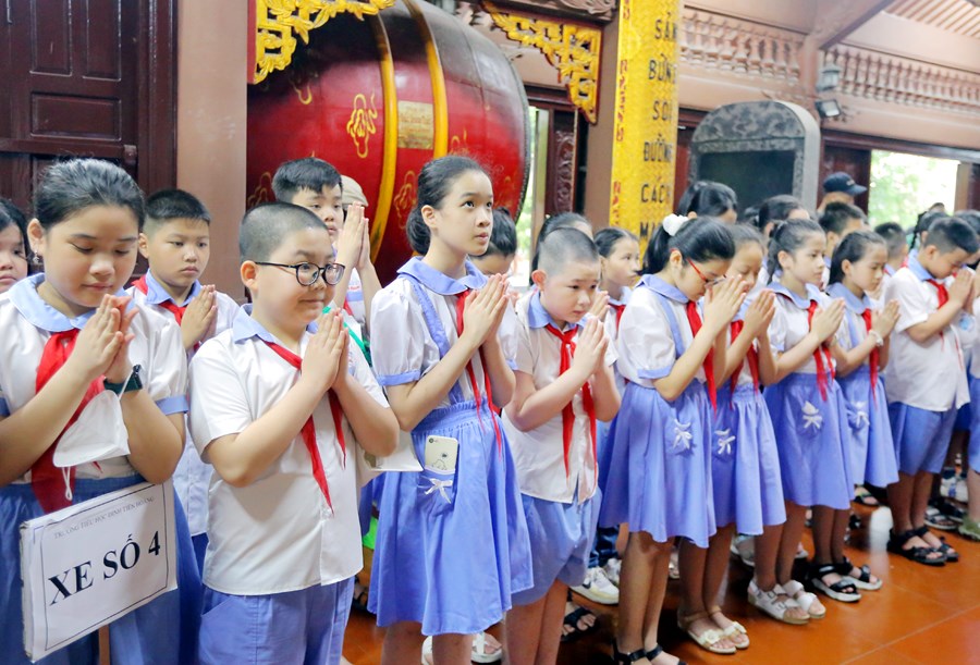 Đứng trước lư hương khói thơm ngào ngạt, trong tiếng trống, tiếng chuông linh thiêng, uy nghi, các thầy cô giáo cùng hơn 200 em học sinh tiêu biểu của trường Tiểu học Đinh Tiên Hoàng đã dâng đóa hoa tươi, thắp nén hương thơm tỏ lòng thành kính tri ân trước những anh minh lỗi lạc của Đất nước. Nguyện hứa sẽ học tập, tu dưỡng, rèn luyện thật tốt xứng đáng với sự hy sinh to lớn của các anh hùng liệt sỹ.
