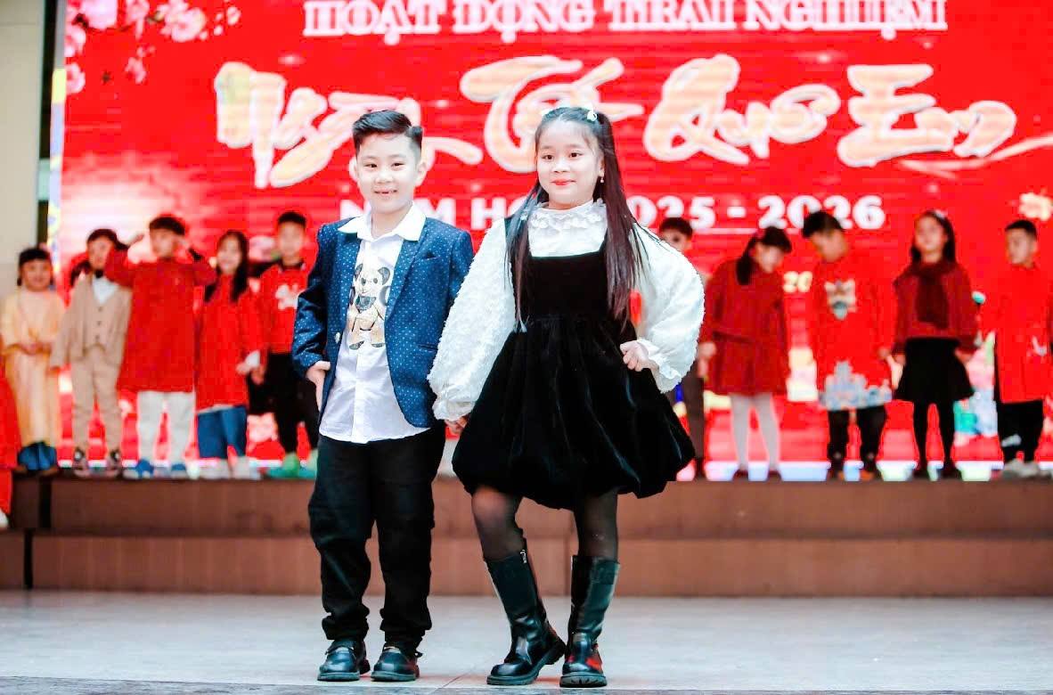 Sân khấu sắc màu: Mãn nhãn với những tiết mục văn nghệ sôi động và màn trình diễn thời trang ngày Tết "cực chất" từ các mẫu nhí Khối 1.