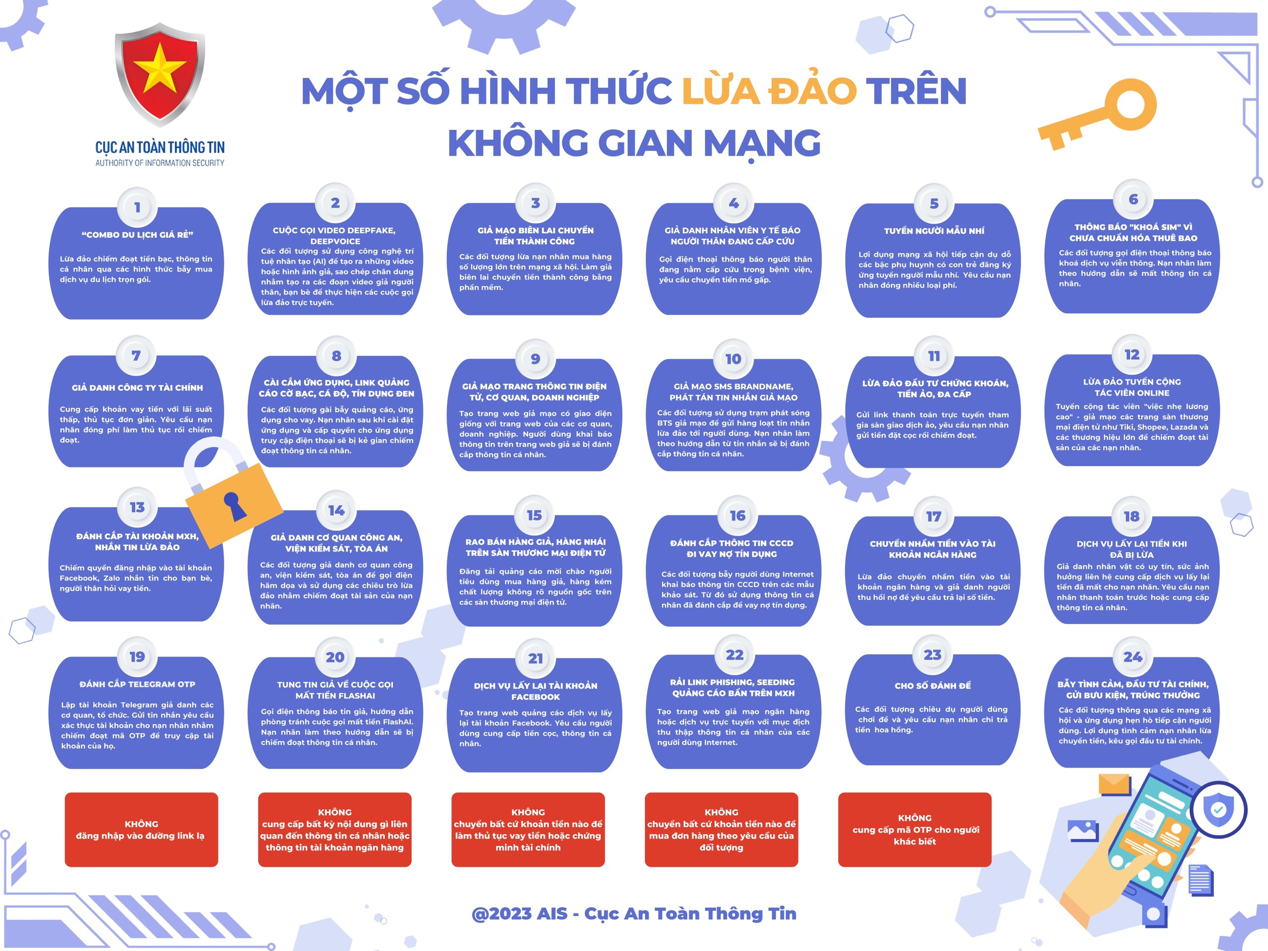 Có 3 nhóm lừa đảo chính (giả mạo thương hiệu, chiếm đoạt tài khoản và các hình thức kết hợp khác) với 24 hình thức lừa đảo đang diễn ra trên không gian mạng Việt Nam, nhắm vào các nhóm đối tượng: Người cao tuổi, trẻ em, sinh viên/thanh niên, các đối tượng công nhân/người lao động, nhân viên văn phòng.