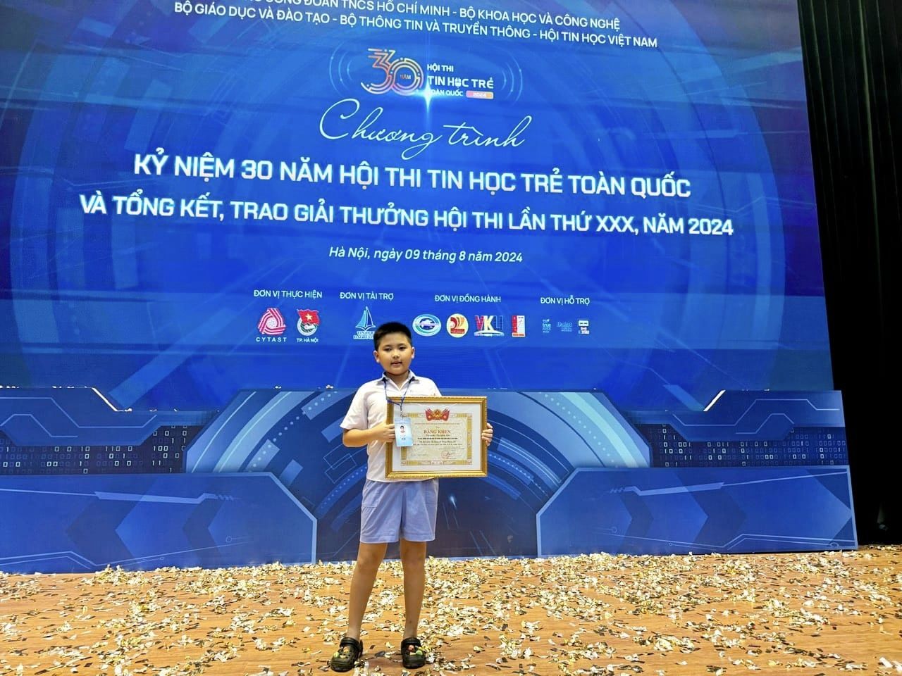 Hội thi Tin học trẻ toàn quốc lần thứ XXX diễn ra trong 3 ngày từ ngày 7 đến 9/8 tại thủ đô Hà Nội với sự tham gia tranh tài của 181 thí sinh đến từ 34 tỉnh, thành phố trên cả nước ở 7 bảng thi: bảng A ( thi lập trình khối Tiểu học ), bảng B ( thi lập trình khối THCS ), bảng C1 ( thi lập trình khối THPT chuyên ), bảng C2 ( thi lập trình khối THPT không chuyên ), bảng D1 ( thi phần mềm sáng tạo khối Tiểu học ), bảng D2 ( thi sản phẩm sáng tạo khối THCS ), bảng D3 ( thi sản phẩm sáng tạo khối THPT ). Em Tạ Gia Lộc - Học sinh lớp 5A6 - Trường Tiểu học Đinh Tiên Hoàng đã tham gia dự thi lập trình khối Tiểu học (bảng A) vòng Chung kết Hội thi Tin học trẻ Toàn quốc và vinh dự đạt giải Ba. Nhà trường ghi nhận và biểu dương sự nỗ lực không ngừng và thành tích tuyệt vời của em Tạ Gia Lộc. Thầy cô và các bạn tự hào về em. Chúc em sẽ tiếp tục vươn cao, vươn xa hơn nữa trong tương lai và ngôi trường Tiểu học Đinh Tiên Hoàng sẽ mãi là nơi chắp cánh cho những ước mơ của em.