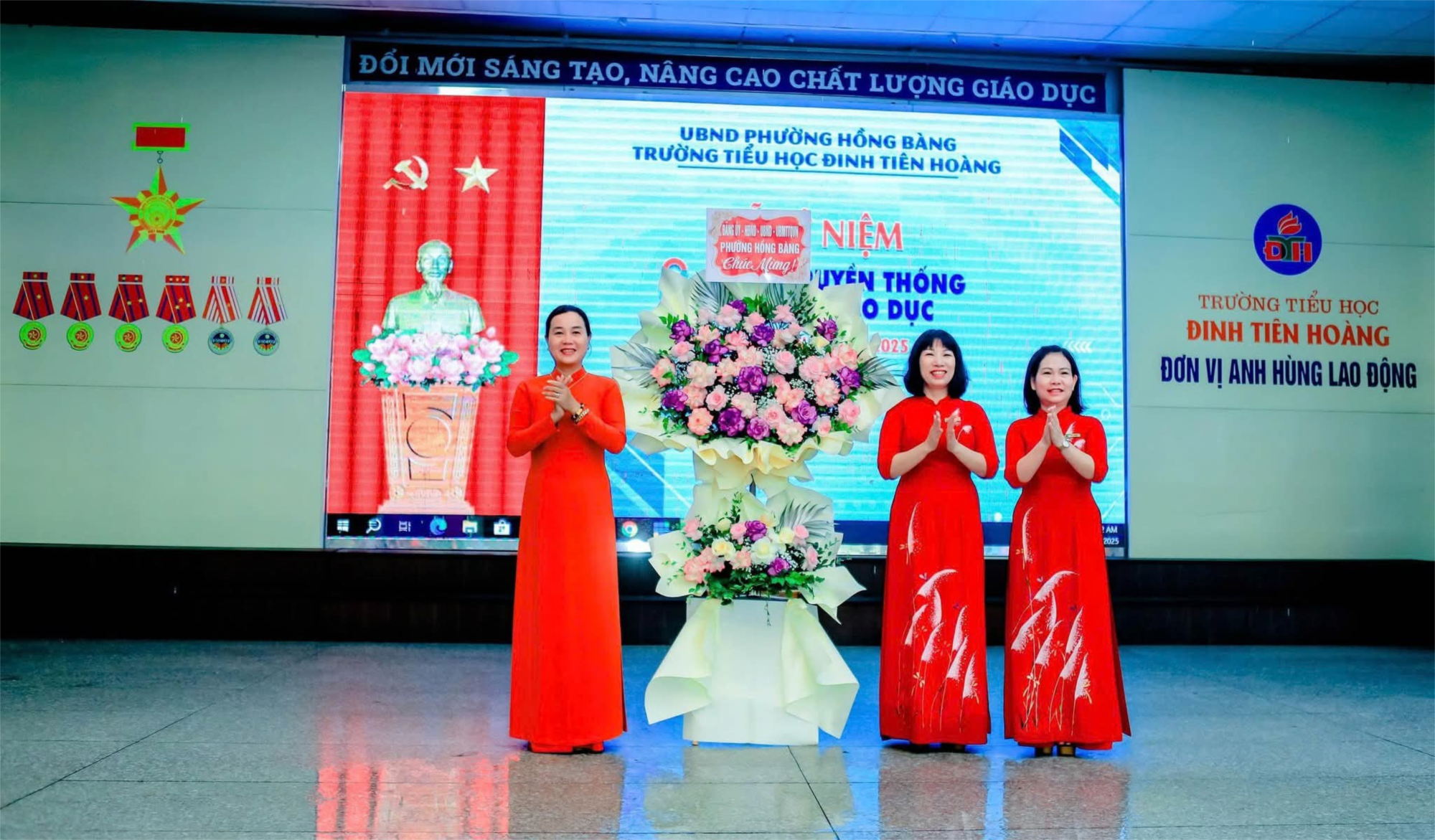 Trong không khí trang nghiêm của buổi lễ. Nhà trường cũng vinh dự đón nhận những lẵng hoa chúc mừng của UBND phường Hồng Bàng, các ban ngành đoàn thể, các đơn vị kết nghĩa,…